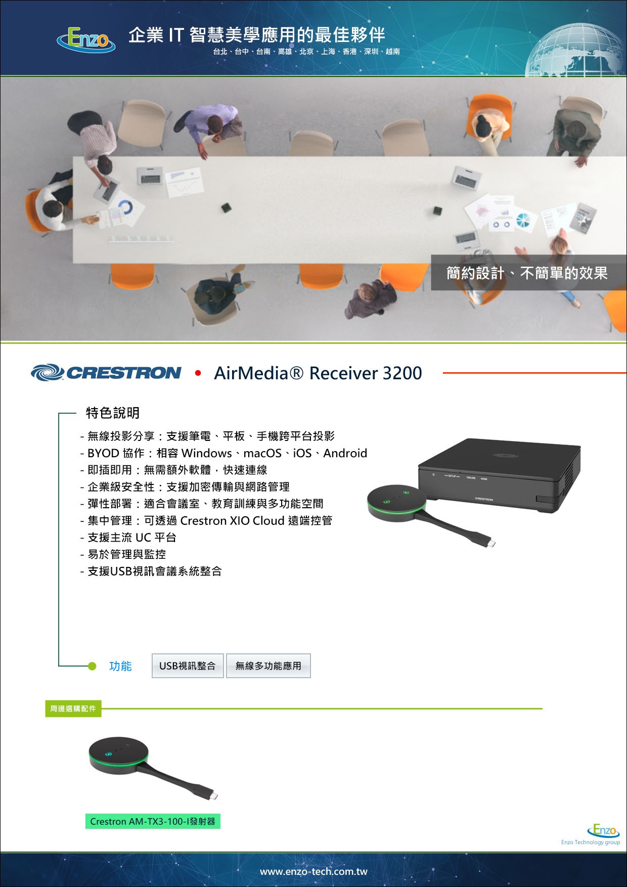Crestron AirMedia AM-3200 的誕生,正是為了解決這個長久以來的痛點。作為快思聰 (Crestron) 最新世代的旗艦級無線簡報系統,它不僅能讓您體驗毫秒級延遲的 4K 高畫質無線投影,更帶來了革命性的 「無線視訊會議 (BYOM - Bring Your Own Meeting)」 功能。透過恩左科技的專業建置,AM-3200 將讓您的會議桌回歸極致清爽,只要帶著筆電坐下,一切盡在無線掌握之中。