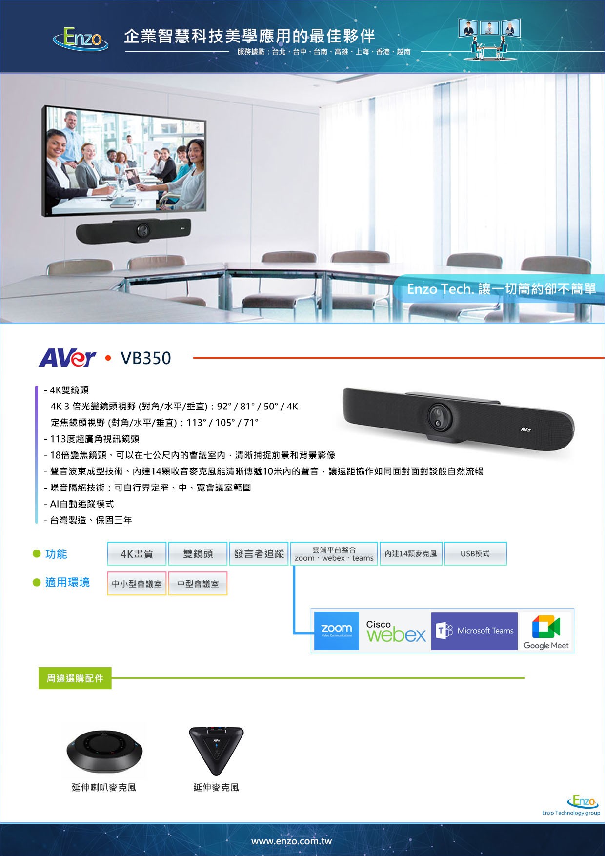 AVer VB350 帶著革命性的「雙鏡頭系統」強勢登場,徹底解決了中大型空間「看不遠、線材亂」的痛點。它將一顆 113° 的超廣角鏡頭與一顆具備強大光學能力的 PTZ 鏡頭完美結合在俐落的音箱中。透過恩左科技的專業整合,VB350 讓您只需一條 USB 線,就能享有廣播級的光學變焦與劇院級的聲學震撼。