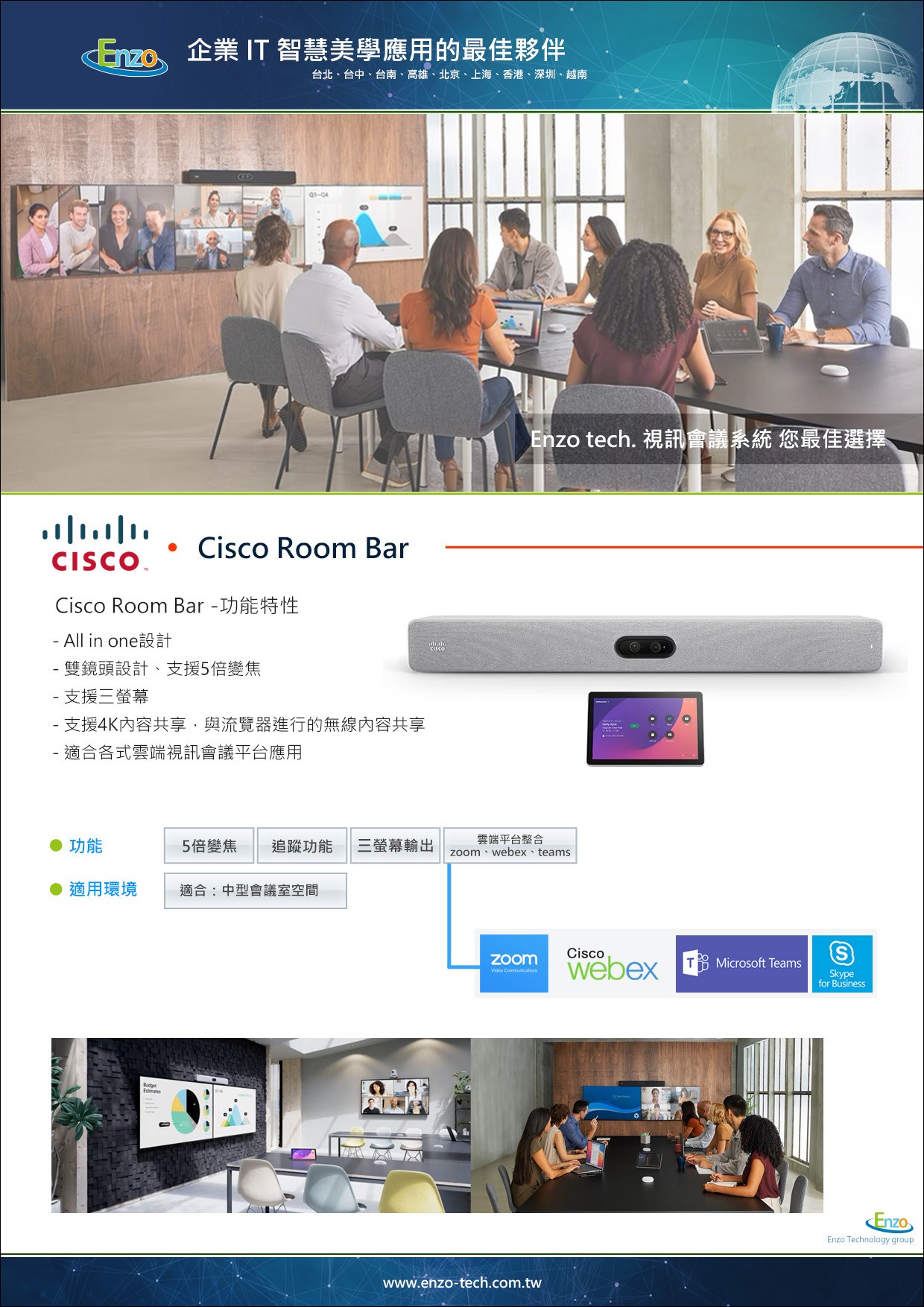 A:Cisco Room Bar 適合 1-7 人小型空間,具備單鏡頭與雙螢幕輸出;而 Cisco Room Bar Pro 擁有更強大的處理器、搭載 48MP+12MP 雙鏡頭系統,並支援最高 三螢幕輸出 與更多元的外部麥克風擴充,專為 5-12 人的中型高階會議室設計。