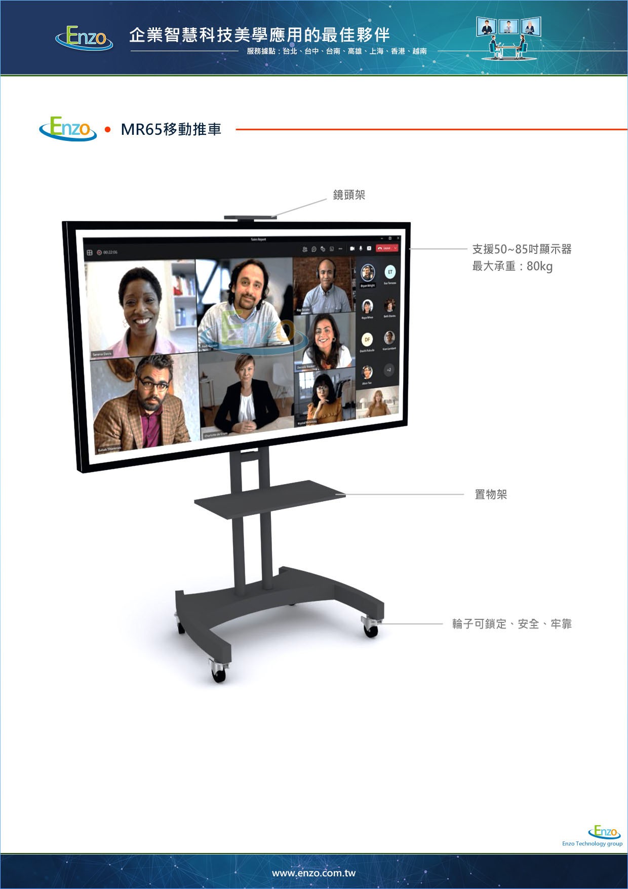 在追求「敏捷辦公」的 AI科技時代,顯示設備不應被束縛在牆上。恩左科技旗艦款 ENZO MR65 移動架,專為中型螢幕與專業視訊需求量身打造。