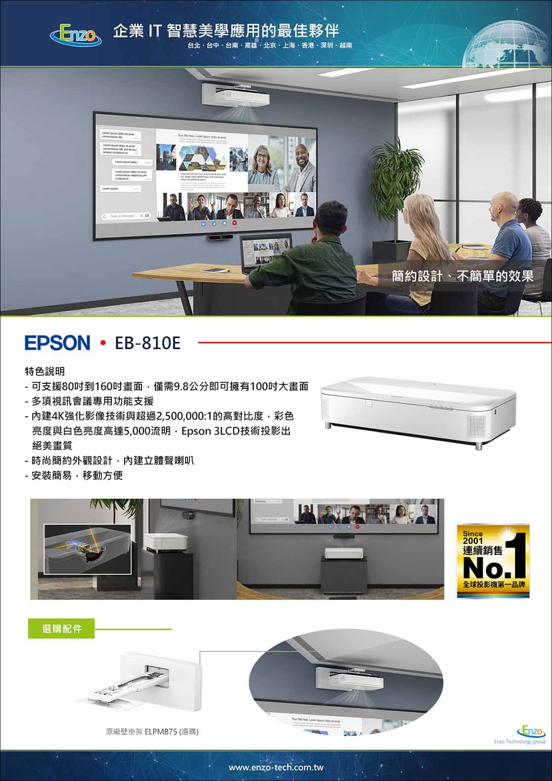 雖然 EB-810E 可以直接投射在白牆上,但為了發揮 5,000 流明與 4K 畫質的最大潛力,我們建議搭配超短焦專用抗光幕 (ALR)。這能有效吸收來自天花板的環境光,讓對比度與色彩鮮豔度提升數倍,即使在明亮環境下也能媲美液晶電視。