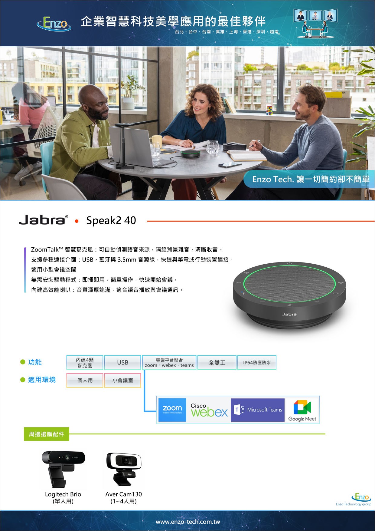 A:沒有。Speak2 40 是專為電腦設計的有線會議揚聲器,必須透過 USB 連接供電與傳輸。若您需要連接手機藍牙,請參考 Speak2 55。