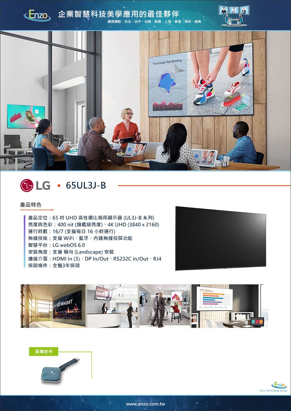 不同於一般家用電視,LG 65UL3J-B 針對「商用環境」進行了優化,支援 16/7 (每日 16 小時) 穩定運行,並具備強大的無線分享能力。透過恩左科技的規劃,這台顯示器將協助您以最經濟的預算,建置出最專業的視訊會議與數位看板空間。