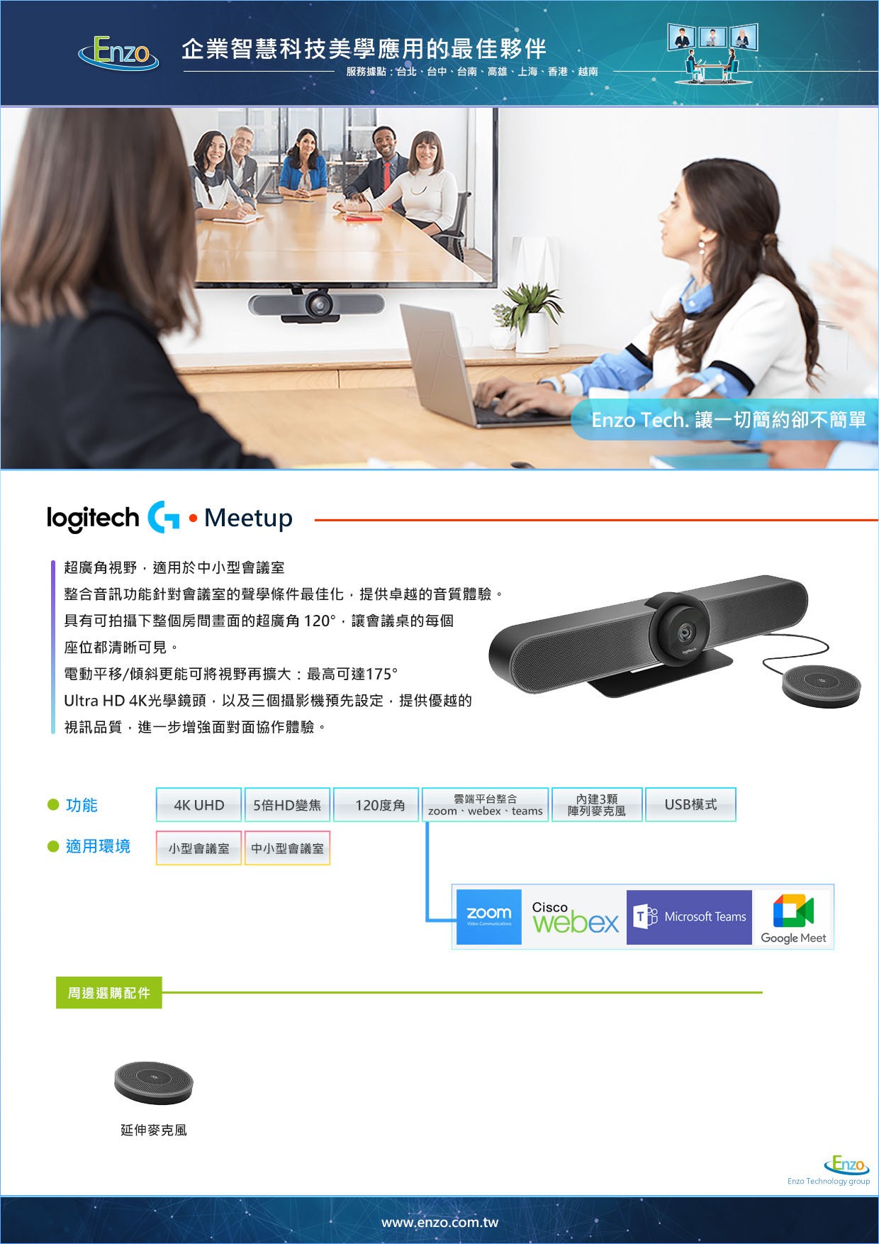 最完美的體驗範圍是距離攝影機 3-4 公尺內的空間。如果您是超過 10 人的中大型會議室,恩左科技建議您升級選擇 [Logitech Rally Bar] 系列。