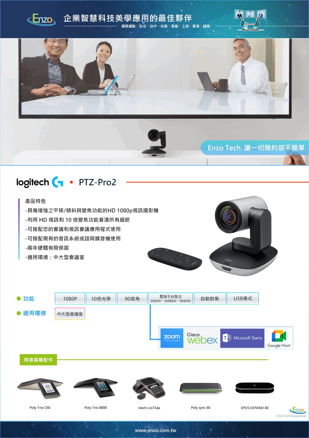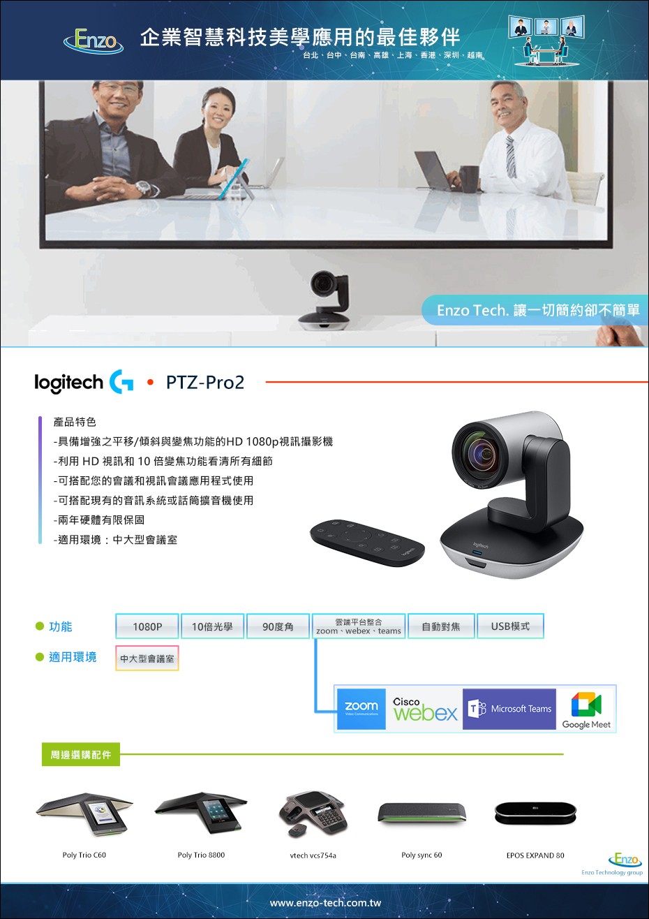 穩定耐用的專業視訊首選Logitech PTZ Pro 2 是一款專注於「影像極致」的產品。如果您已經擁有高品質的收音設備,只需要一台強大、耐用且變焦精準的攝影機來提升視覺品質,PTZ Pro 2 無疑是目前市場上性價比最高的選擇。[立即提升您的視訊品質 - 線上諮詢] 想了解 PTZ Pro 2 如何與您現有的音響設備整合嗎?聯繫恩左科技,獲取專業視訊工程規劃建議。