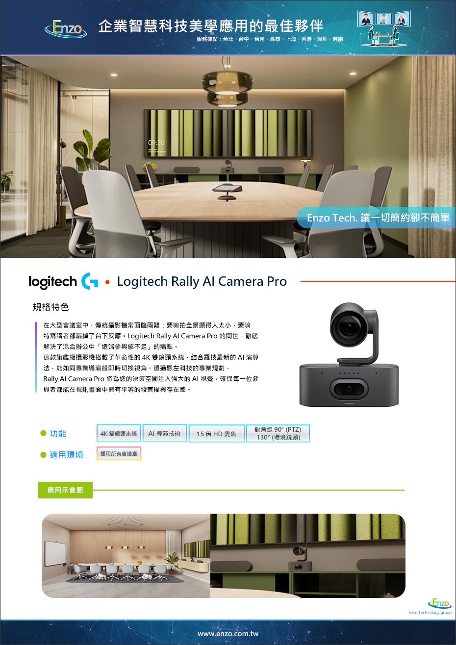 [立即為您的會議室升級旗艦級 AI 視效!]想了解 Rally AI Camera Pro 如何與您現有的 Rally 系統 或 DSP 音訊 整合?或是需要規劃一站式的混合辦公方案?恩左科技提供羅技旗艦產品的場勘、實機 Demo 與專業售後維護。