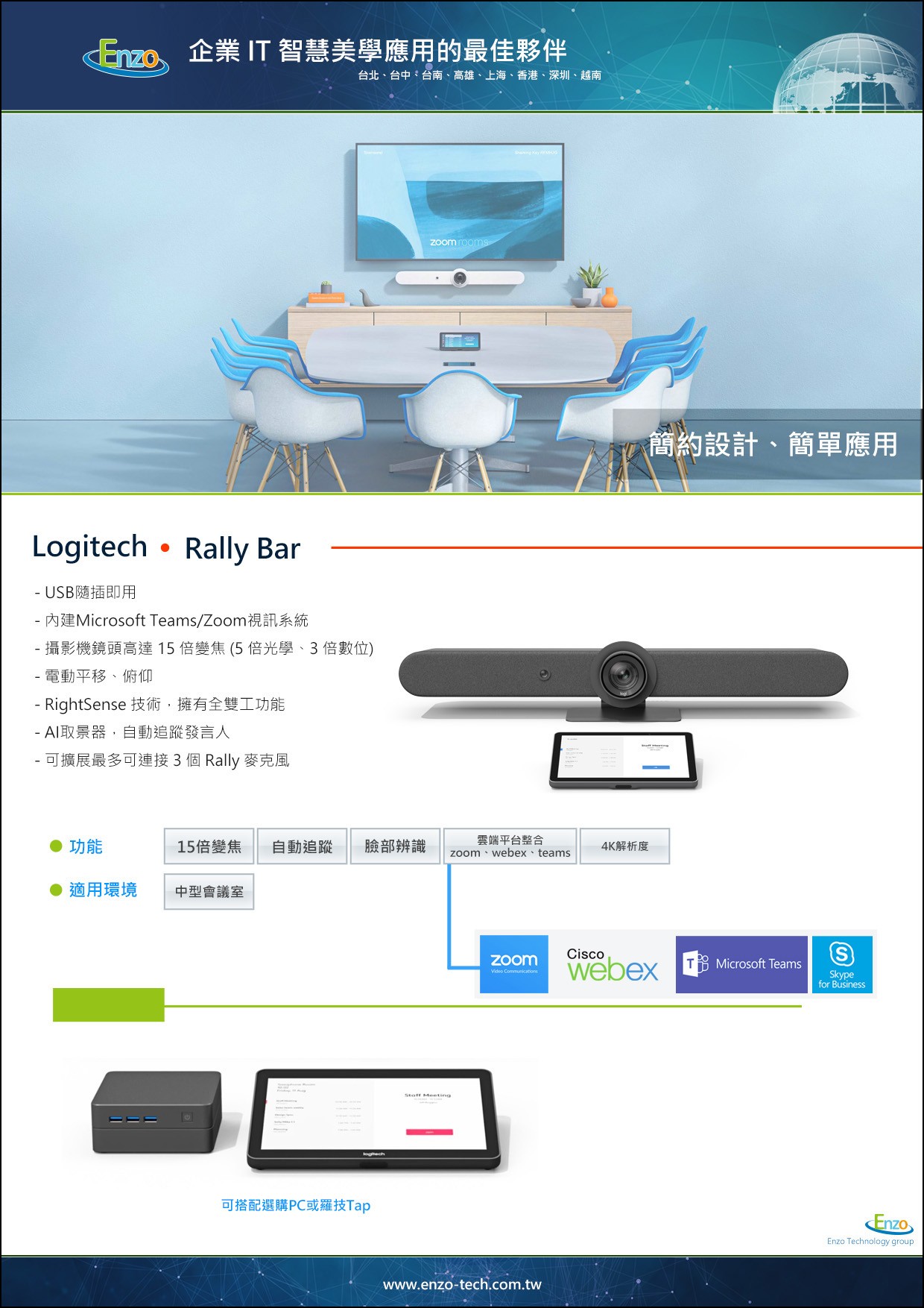 專為中大型會議室打造的 Logitech Rally Bar,搭載 5 倍光學變焦與 AI 智能取景窗。恩左科技提供專業視訊系統規劃與安裝,支援 Teams/Zoom 雙模式運作。立即查看詳細規格與報價。