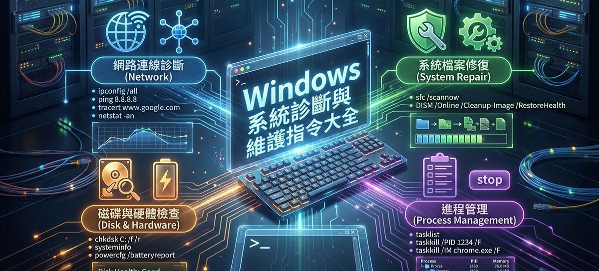 在 Windows 發生問題時(例如網路斷線、系統變慢、檔案損毀),圖形化介面(GUI)有時無法提供足夠的資訊。這時,命令提示字元 (CMD) 或 PowerShell 就是最強大的手術刀。以下整理了最實用、最常見的檢查指令,分為 網路診斷、系統修復、磁碟檢查 與 系統資訊 四大類。