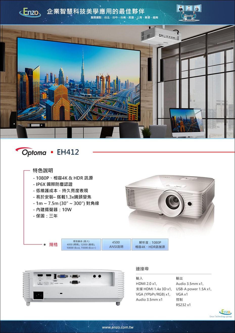 恩左科技解答: EH412 具備先進的節能技術,燈泡壽命長達 15,000 小時。如果每天開會 4 小時,大約可以使用 10 年以上!對於預算型用戶來說,這比一次性購買昂貴的雷射機種更具成本優勢