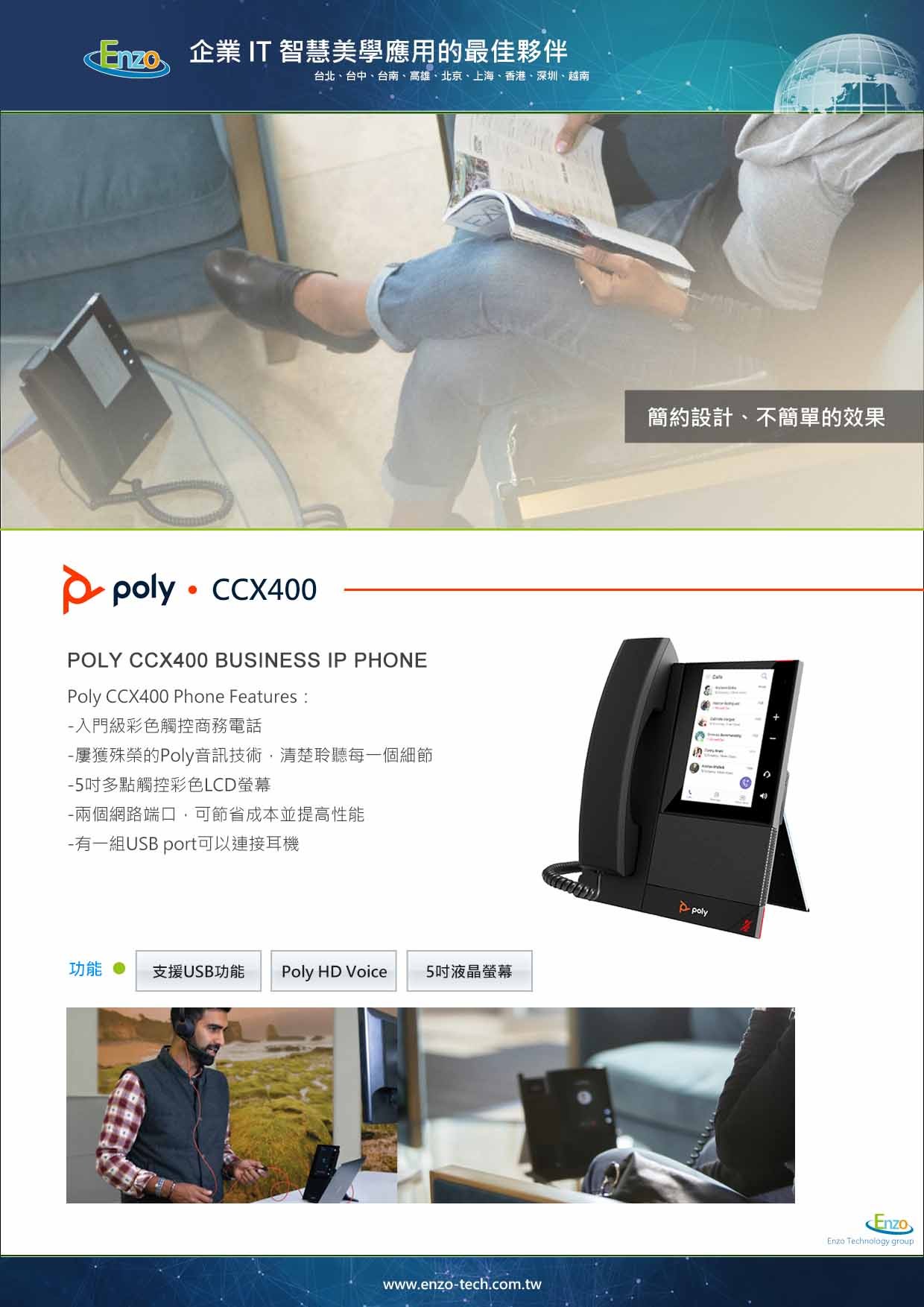 Q:CCX 400 跟一般 IP 話機有什麼不同?恩左科技解答: 一般話機僅能撥打電話,CCX 400 是專門為 Teams 設計的「媒體商務電話」,它能同步您的 Teams 行事曆,並讓您直接在話機上看到同事的忙碌狀態(Presence)。Q:我的辦公室沒有 PoE 交換機,這台話機還能用嗎?恩左科技解答: 可以。雖然 CCX 400 原生支援 PoE 供電以簡化配線,但恩左科技亦可為您另行配置原廠電源變壓器。Q:CCX 400 支援藍牙嗎?恩左科技解答: CCX 400 為入門款,不具備內建藍牙功能(更高階的 CCX 500/600 才有)。若您有無線耳機需求,恩左建議搭配 USB 無線耳機適配器使用。