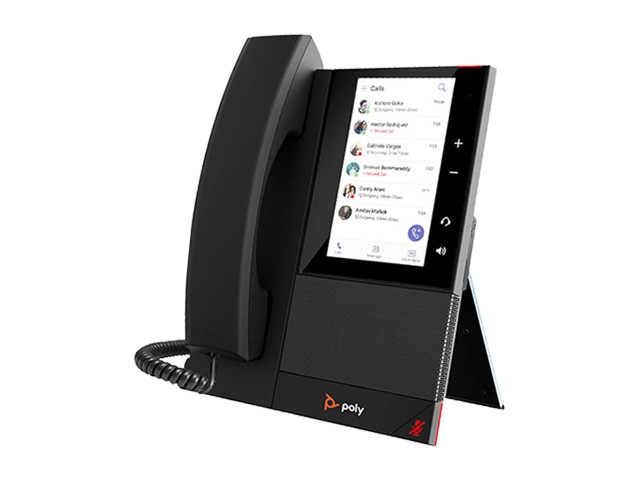顯示螢幕:5 吋彩色 LCD 觸控螢幕 (像素),16:9 寬高比。使用者介面:基於 Android 9 系統,支援虛擬鍵盤與螢幕保護程式。音訊技術:Poly HD Voice、Poly Acoustic Clarity 技術、NoiseBlockAI 噪音屏蔽、Acoustic Fence 環境噪音消除。連線能力:2 個 RJ-45 網路連接埠 (10/100/1000 Mbps)/1 個 USB-A 埠 (用於媒體或耳機連接)/RJ9 耳機接口。軟體支援:內建 Microsoft Teams 或 Zoom 原生應用程式(視型號而定)。安全性:支援 TLS 與 AES 256 位元加密。管理與維護:Poly Lens 雲端管理、Poly 零接觸組態 (Zero Touch Provisioning)。電源:支援 PoE (Power over Ethernet)。