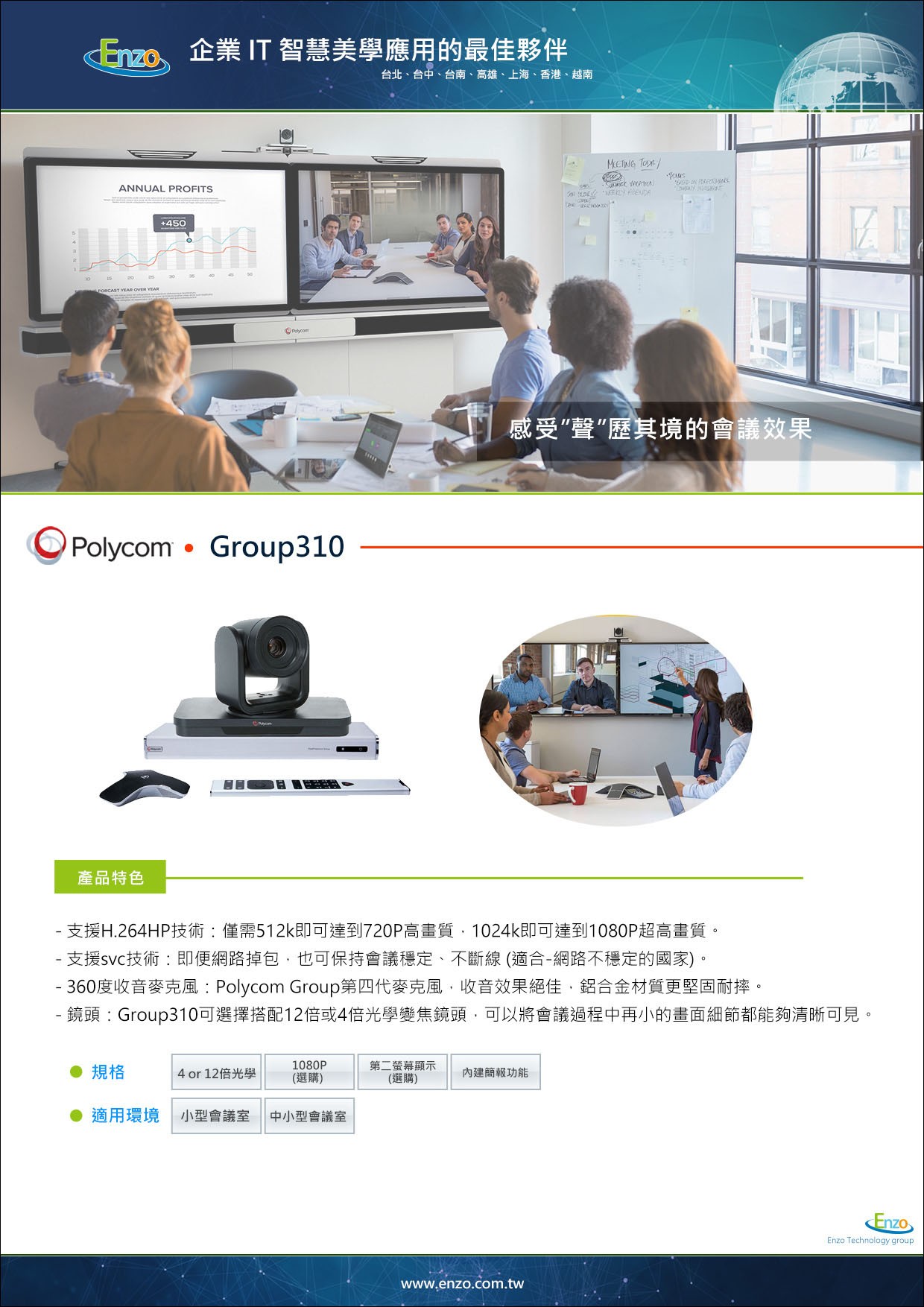 Group 310 具備極高的相容性。無論您的總部使用的是 Polycom 平台、Cisco 系統還是其他標準協定設備,恩左科技皆能協助您快速完成對接,實現無障礙通訊。