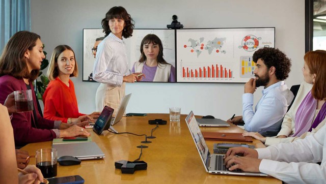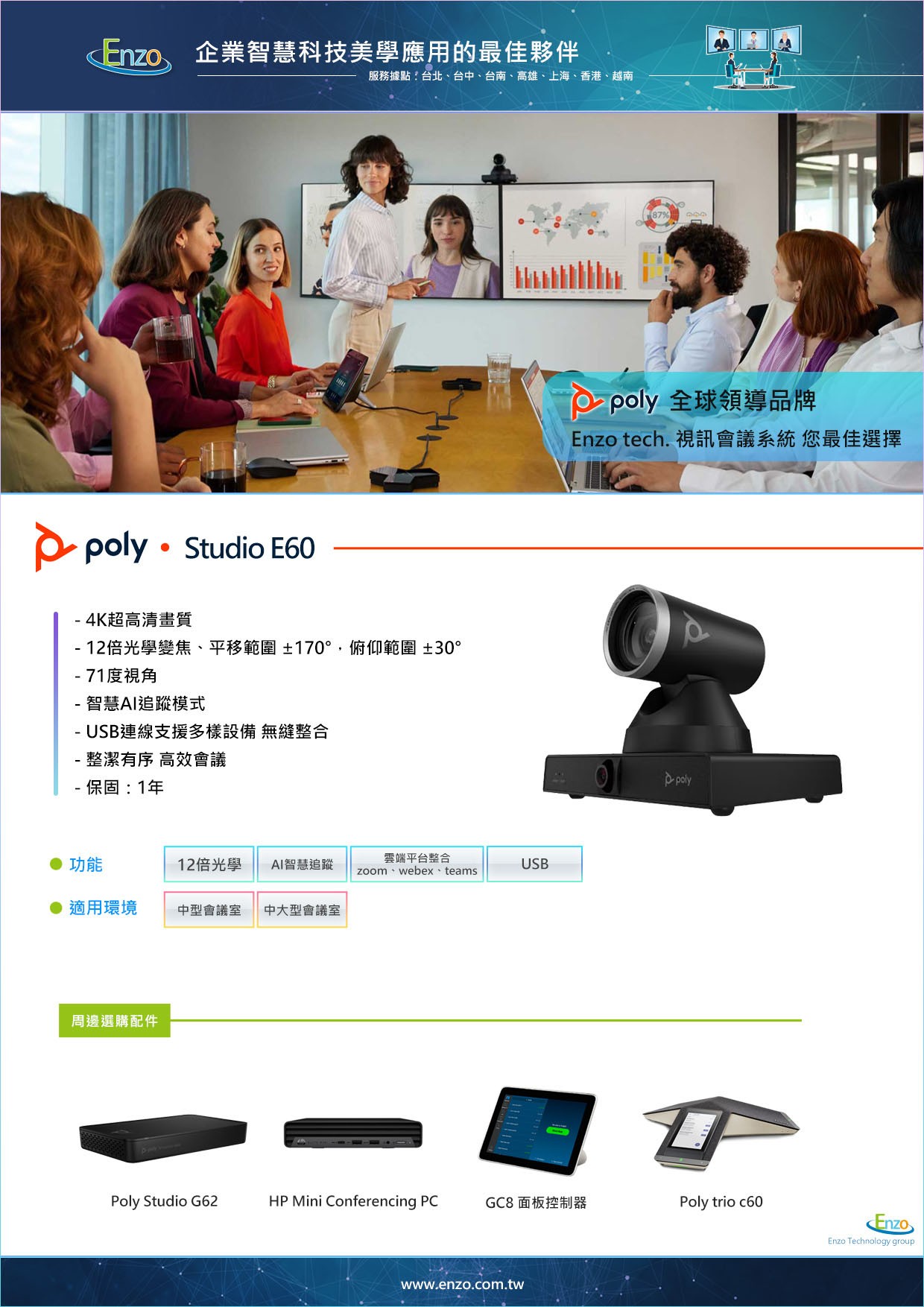 A:E60 主要是專業攝影機。雖然它可能內建收音孔,但僅供 AI 追蹤定位使用,不建議作為會議收音主力。建議搭配 Poly Sync 60 揚聲器或 Poly Trio C60 會議電話,以獲得與 4K 畫面匹配的頂級音質。