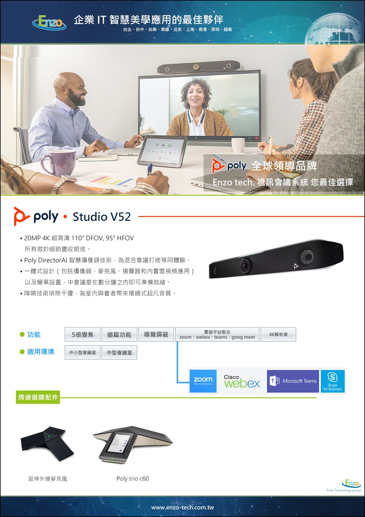 A:不需要。V52 支援 UVC/UAC 標準協議,隨插即用。但強烈建議安裝免費的 Poly Lens Desktop 軟體,以進行更細緻的鏡頭控制(如手動變焦、儲存預設點)與韌體更新。