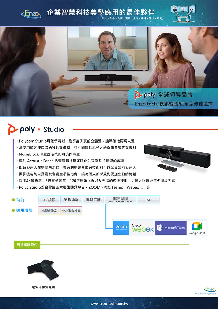 Poly Studio 商務視訊會議設備,提供4K高清影像與AI智能取景,適合各類會議室。支援Zoom、Teams提升遠距會議體驗!