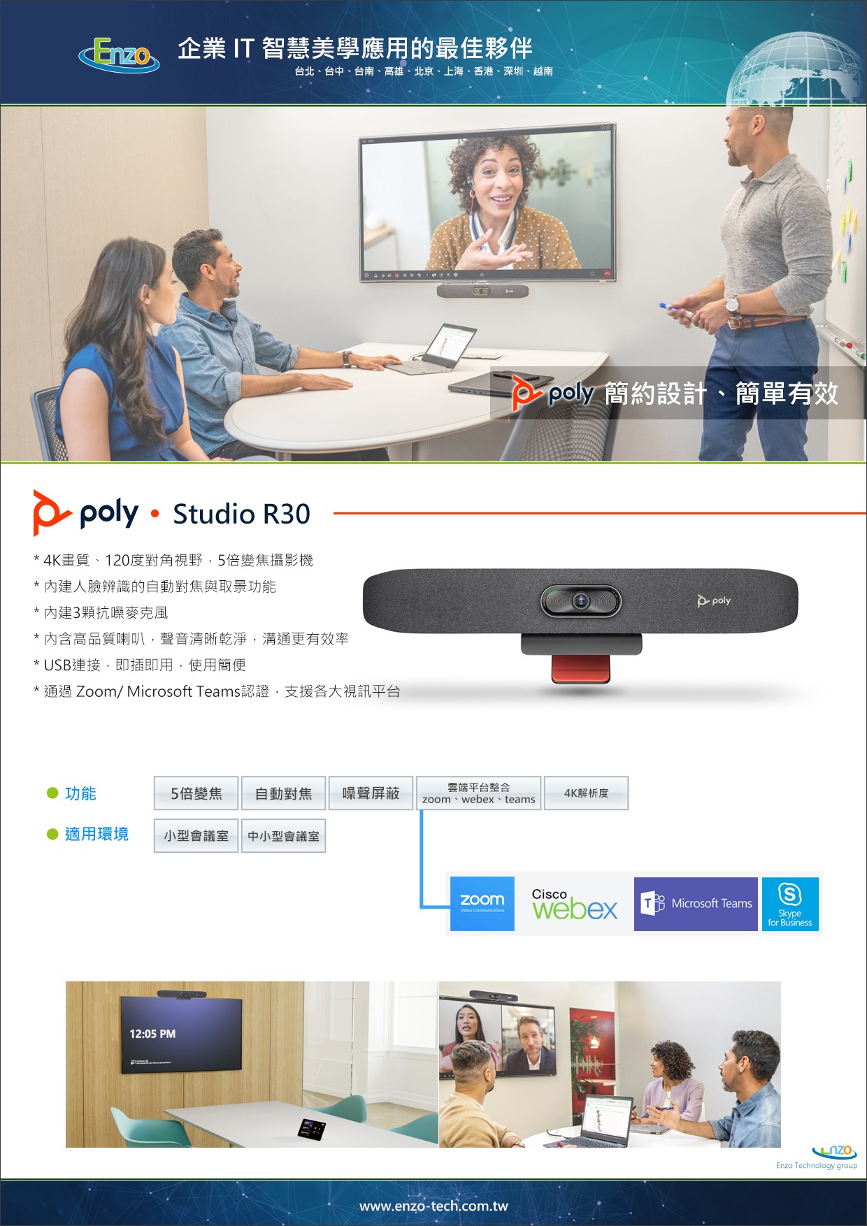 Poly Studio R30 是專為現代小型會議室打造的高效 USB 視訊會議解決方案。配備 4K 超高畫質鏡頭與 120° 廣角視野,無論在開放空間或緊湊環境中,都能清晰捕捉每位與會者。其 AI 智慧取景與人臉追蹤功能,能自動聚焦發言者,提升互動效率。內建的多麥克風陣列結合 Poly NoiseBlockAI™ 技術,有效消除背景噪音,確保語音清晰純淨。Poly Studio R30 支援 Zoom、Teams、Google Meet 等主流平台,採用 Plug & Play 設計,安裝快速、操作簡單,是中小企業與遠距團隊最理想的專業會議工具。
