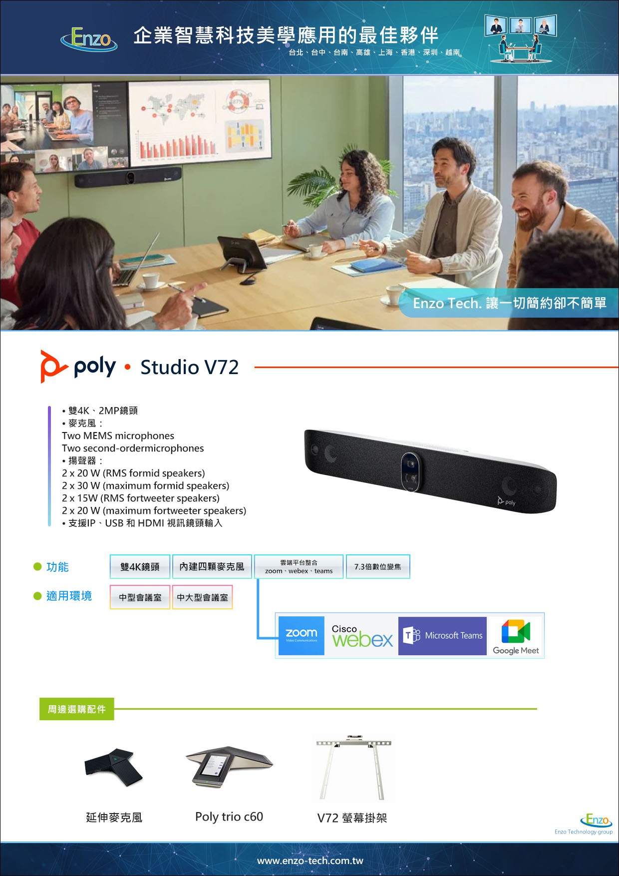 Poly Studio V72 專為會議室設計的智慧視訊會議解決方案Poly Studio V72 4K視訊會議攝影機,專為中型會議室設計,搭載智慧變焦與AI DirectorAI技術,提供清晰影像與NoiseBlockAI降噪。