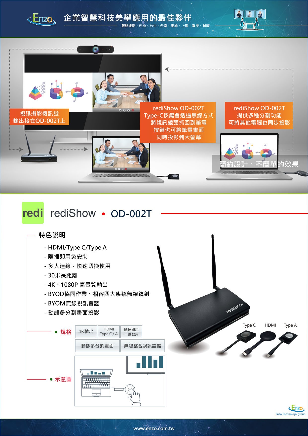 單純買一台 rediShow OD-002T 很簡單,但要讓它與您的視訊設備完美協作,需要 恩左科技 (Enzo Technology) 的專業規劃: