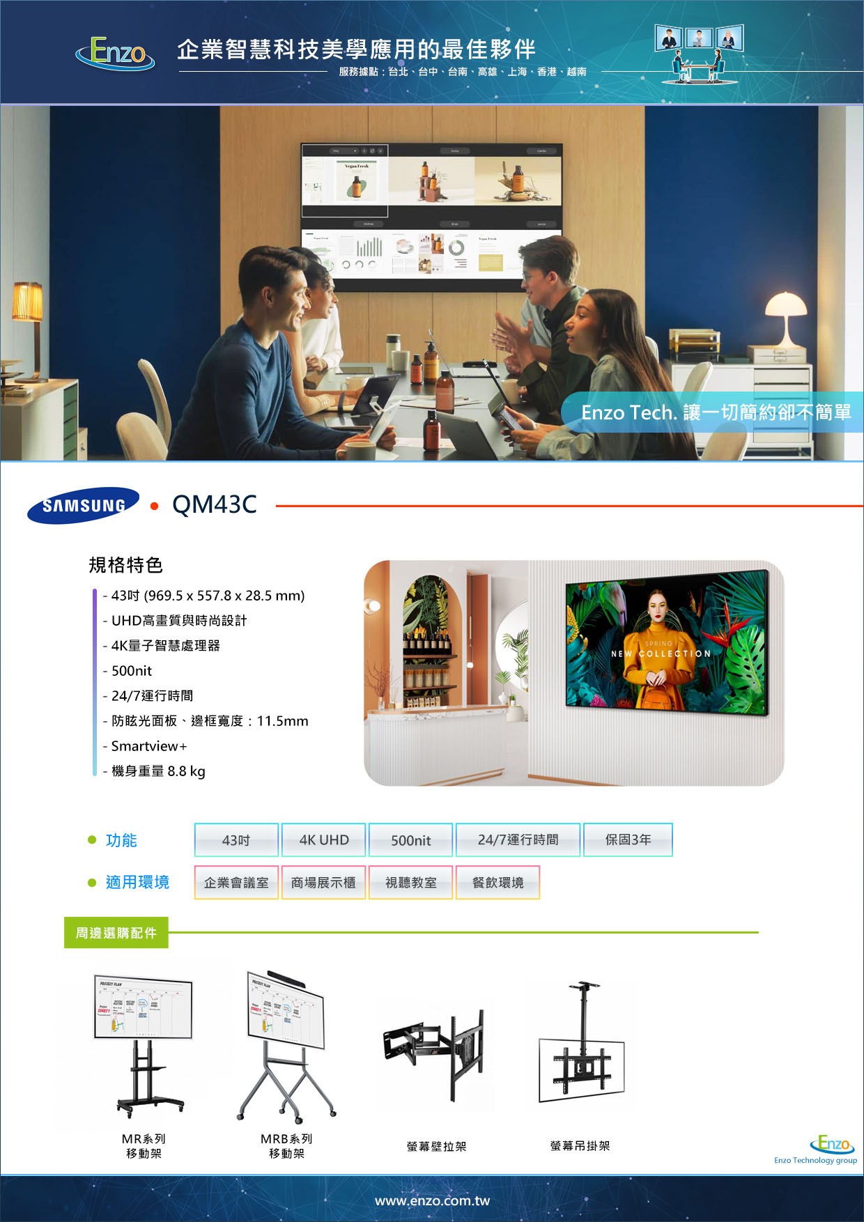 點亮品牌形象的終極視覺方案Samsung QM43不僅是一台顯示器,更是企業在第一線吸引目光的強力武器。它克服了環境光與長時間運作的雙重考驗,結合恩左科技的專業施工,為您的商業空間帶來無與倫比的高端質感。[立即索取 Samsung QM43C 專案報價]想了解更多關於三星商用顯示器的安裝建議嗎?恩左科技提供專業的顯示方案規劃,讓您的商業空間煥然一新。