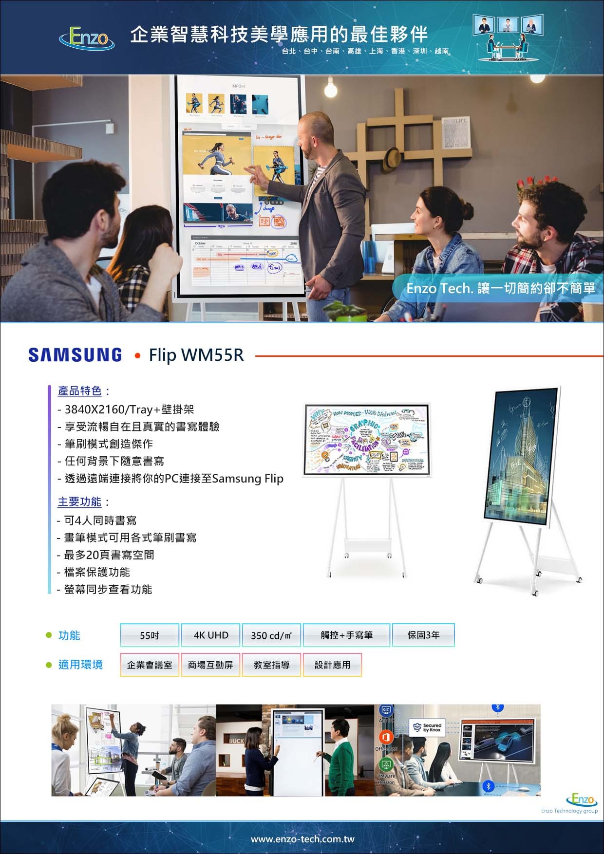A:WM55R 是經典熱銷款,具備完整的書寫與旋轉功能,CP 值極高。新款 Flip Pro (WMB) 則進一步增加了 USB-C (三合一) 接口、支援 AirPlay 2 以及更快的觸控反應速度。若您需要最新的連接規格,歡迎參考我們的 [Samsung Flip Pro 頁面連結]。