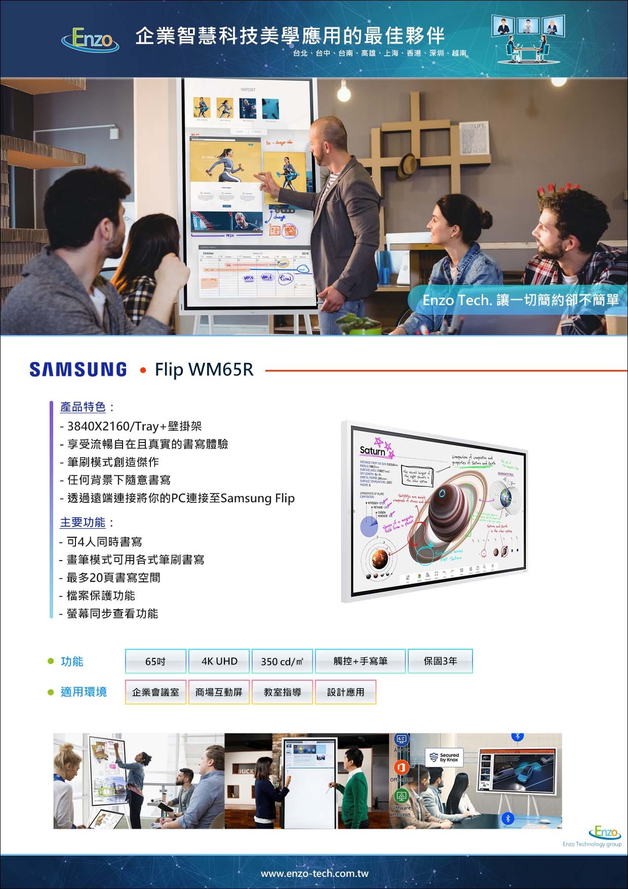 A:Samsung Flip 系列皆未內建鏡頭。但您可以透過 USB 連接第三方視訊設備(如 Logitech 或 Poly 視訊視訊條),即可將 WM65R 升級為高品質的視訊會議系統。