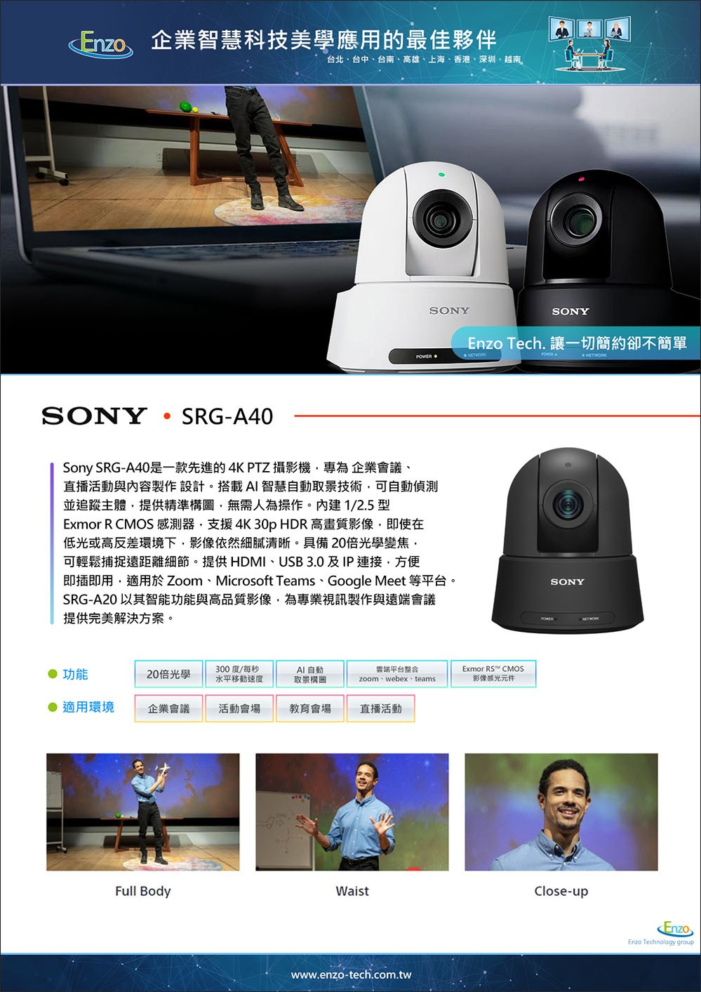 想了解 SRG-A40 如何應用在您的教學或會議流程中?或是需要 NDI 系統的整體規劃?恩左科技提供 Sony 專業攝影機的環境場勘、實機 Demo 與系統安裝一站式服務。
