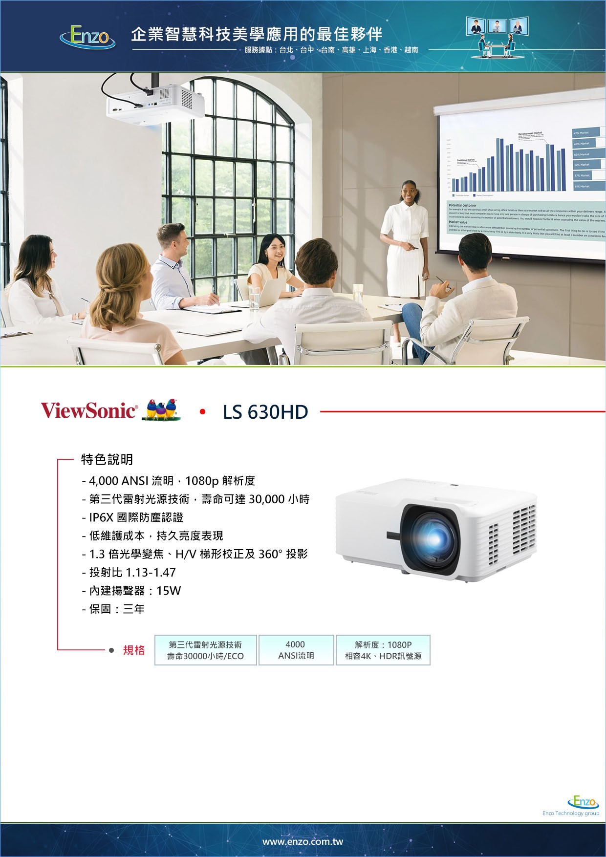 在 2026 年的商務環境中,企業對於硬體的要求已從「能用」轉向「長效與環保」。恩左科技 (Enzo Technology) 明白,頻繁更換燈泡與暗淡的投射畫面是企業效率的隱形殺手。ViewSonic LS630HD 的出現,正是為了定義中小型空間的投影新標準。