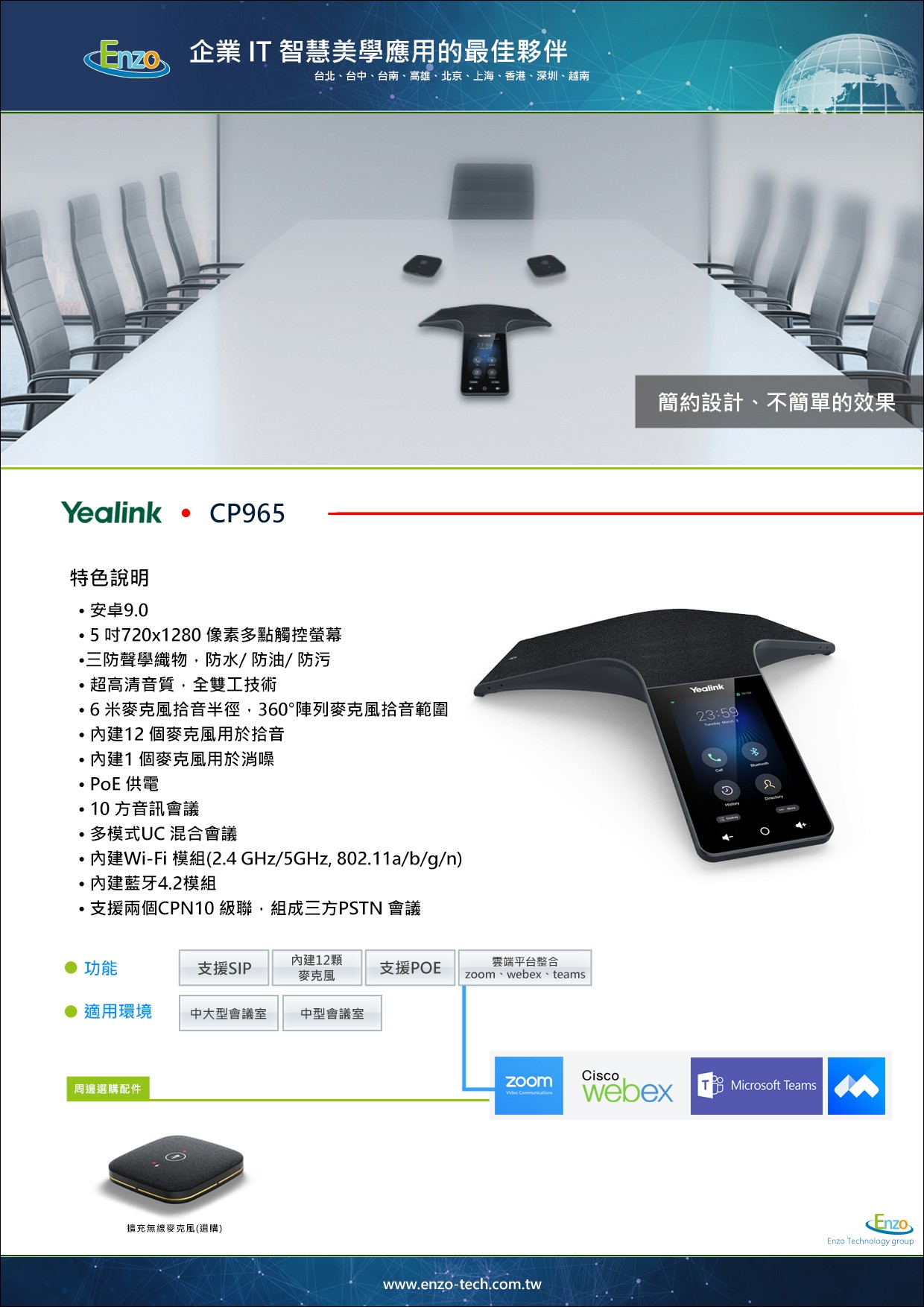 Yealink CP965 是專為中大型會議室打造的旗艦級高畫質 IP 會議電話。它不僅擁有極具現代感的防潑水透音網布設計,機身內更搭載了強大的 Android 9.0 系統與高達 13顆的陣列麥克風。透過恩左科技的專業建置,CP965 將為您的會議桌帶來前所未有的頂級聲學表現與直覺的觸控體驗。
