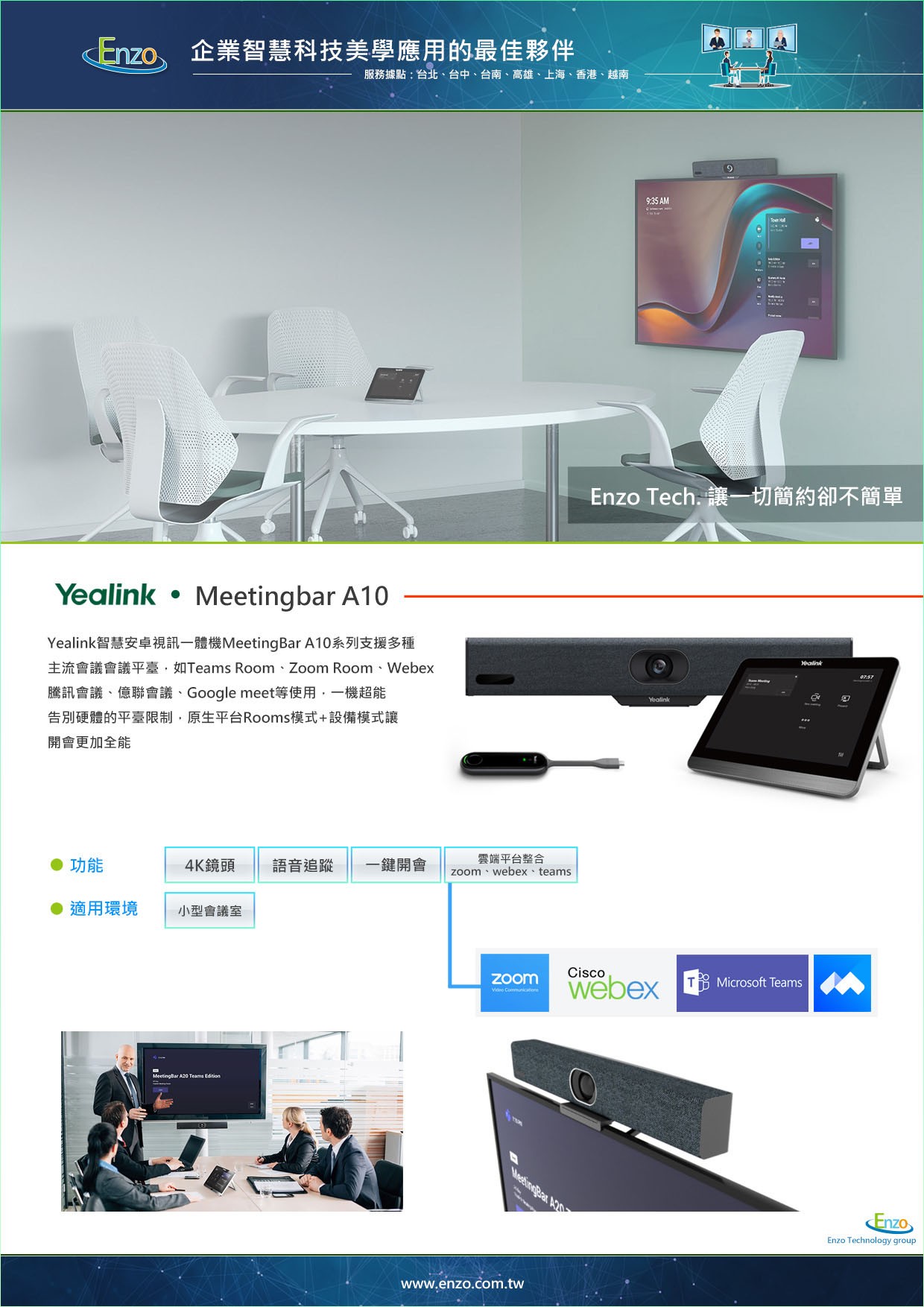 Yealink MeetingBar A10 的出現,徹底改變了小型空間的遊戲規則。它將「攝影機、麥克風、揚聲器、作業系統」完美整合進不到 40 公分的精巧機身中。無論是安裝在牆面上或螢幕上方,A10 都能提供旗艦級的 4K 影像 與 AI 智慧音訊。透過恩左科技的規劃,MeetingBar A10 將協助您的團隊,在每一個角落都能隨時開啟專業的高效率會議。
