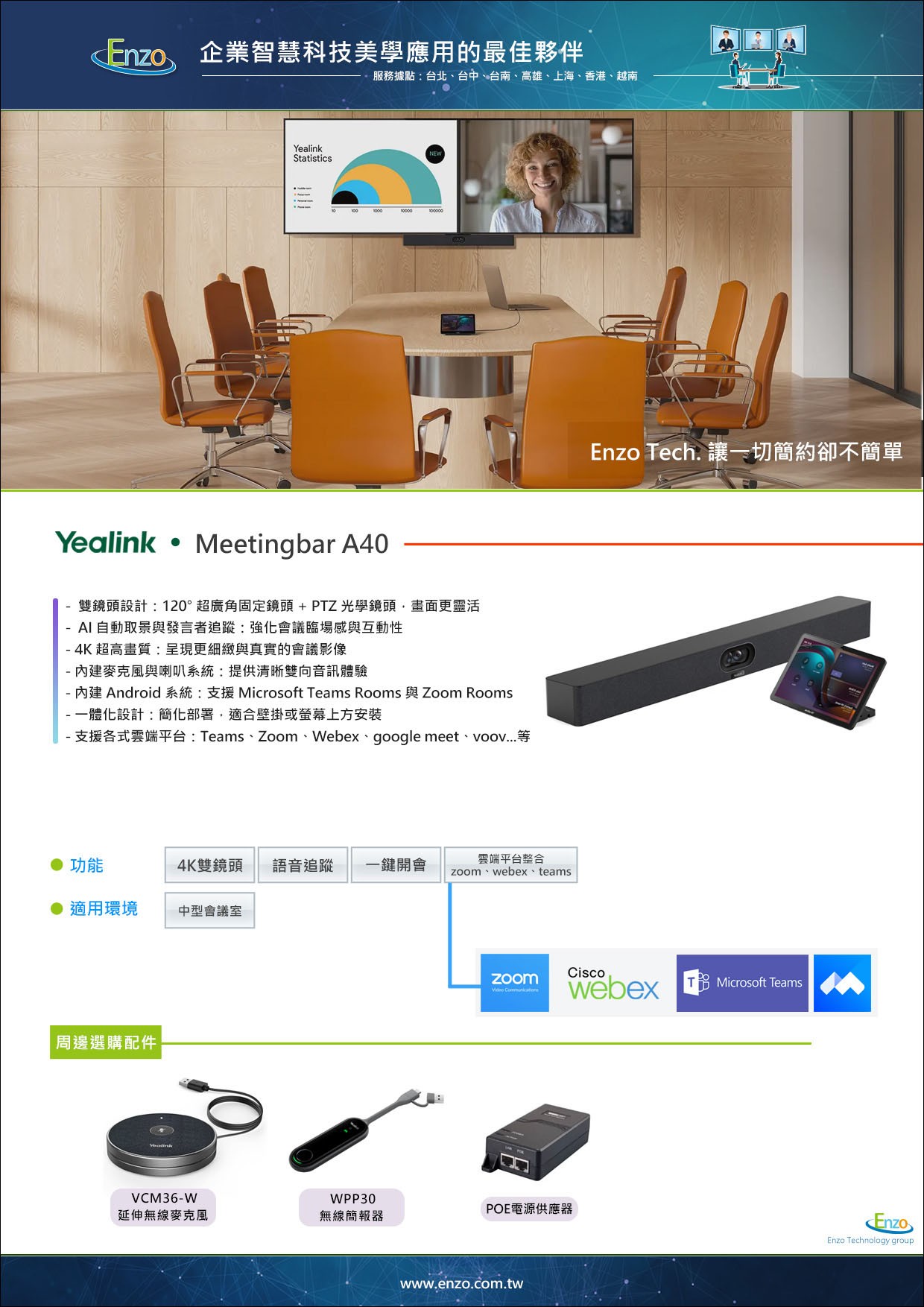 [立即預約實機展示,親自體驗 AI 雙鏡頭的震撼!]想了解 A40 如何優化您的現有空間?或是需要規劃一站式的 Teams Rooms 方案?恩左科技提供 Yealink 旗艦方案的場勘、實機 Demo 與專業售後維護服務。