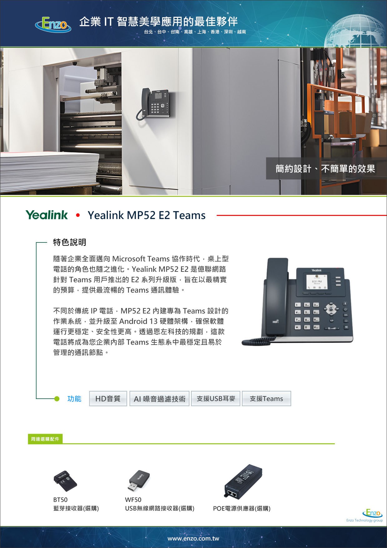 Yealink MP52 E2 用最經濟的方式,整合了 Microsoft Teams 的強大功能與實體電話的穩定性。升級後的硬體架構與 Android 13 系統,讓它成為企業在後疫情時代轉型雲端語音的最明智選擇。[立即優化您的 Teams 通訊環境!]想了解 MP52 E2 如何整合至您的企業 Teams 帳號?或是需要規劃大量部署方案?恩左科技提供 Yealink 全系列設備的場勘、SIP/Teams 帳號設定與專業維修保固服務。