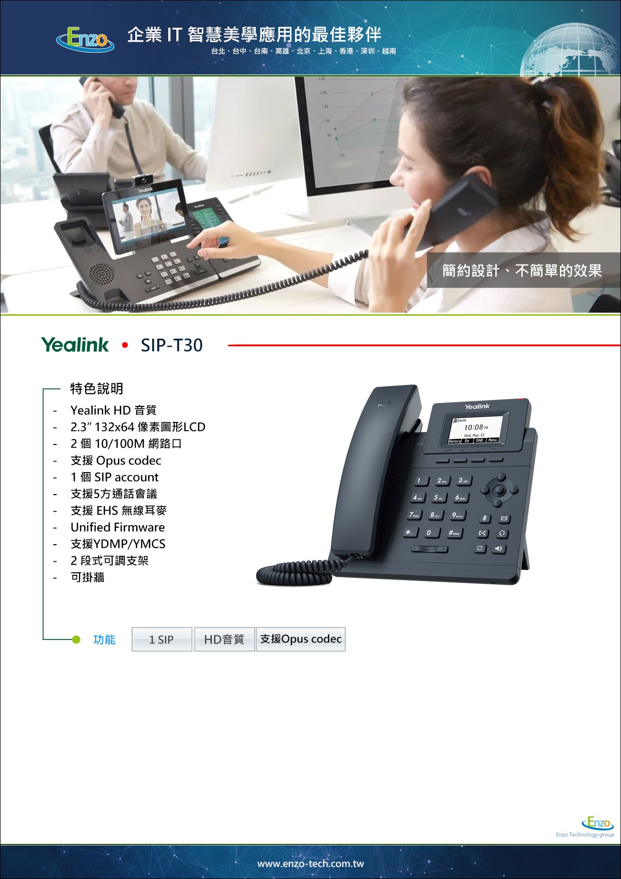 Yealink T30 搭載了先進的音訊處理技術,支援寬頻編解碼器。恩左科技實測證明,即使是在入門等級,T30 的通話清晰度依然能過濾背景雜音,確保每一通商務來電都能精準傳遞。