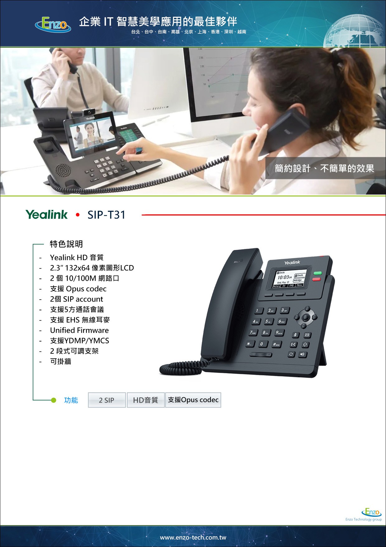 T31 採用 Yealink 專利的智慧消噪技術,能有效抑制打字聲、冷氣運轉聲等背景噪音,為您與客戶提供純淨的通話環境,提升企業專業形象。