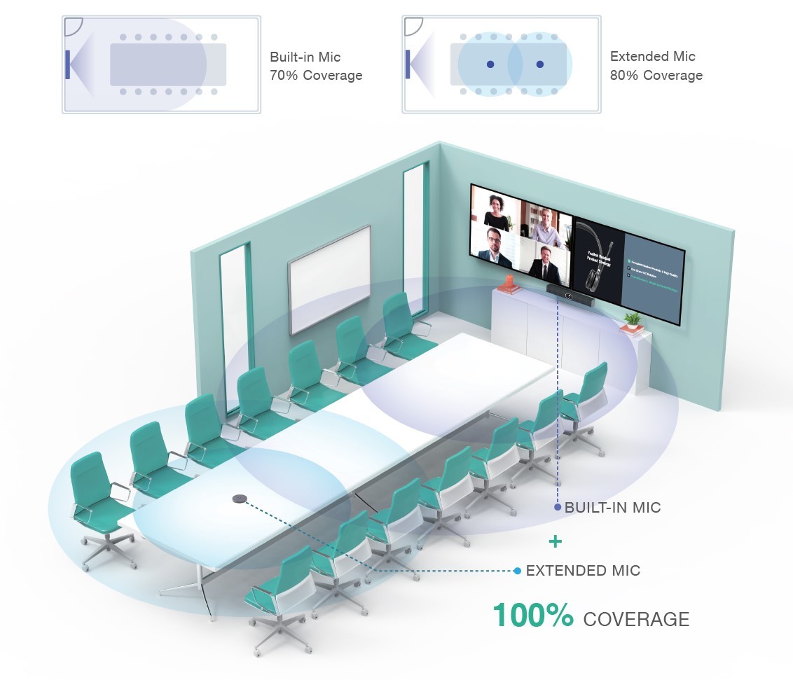 答:視配對的視訊主機(如 MeetingBar 或 MVC 系統)而定,通常支援多台串聯以覆蓋更大的會議空間。