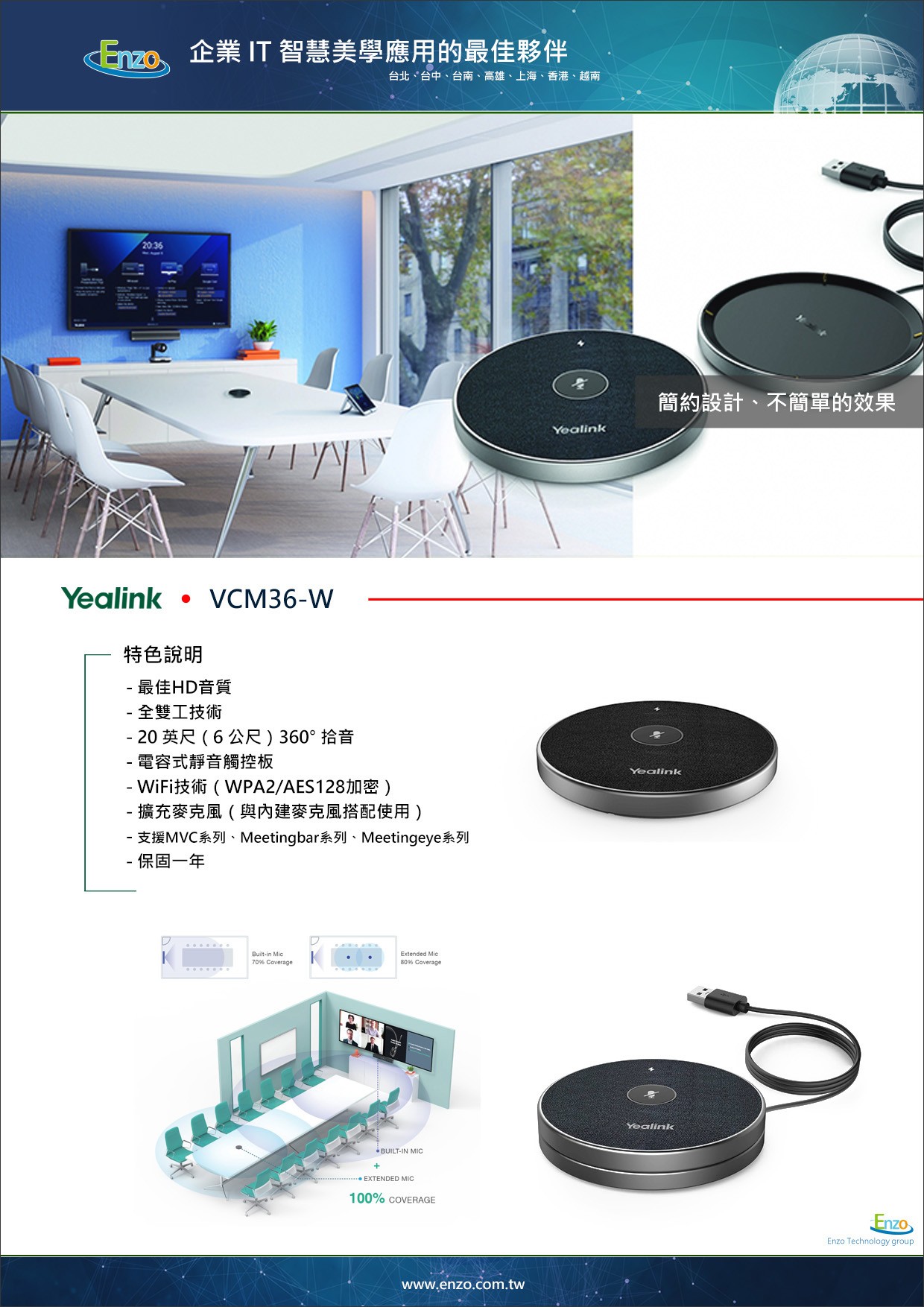 答:Yealink VCM36-W 採用優化的無線技術與加密頻道,能與辦公室網路和平共存,確保音訊傳輸穩定不掉線。