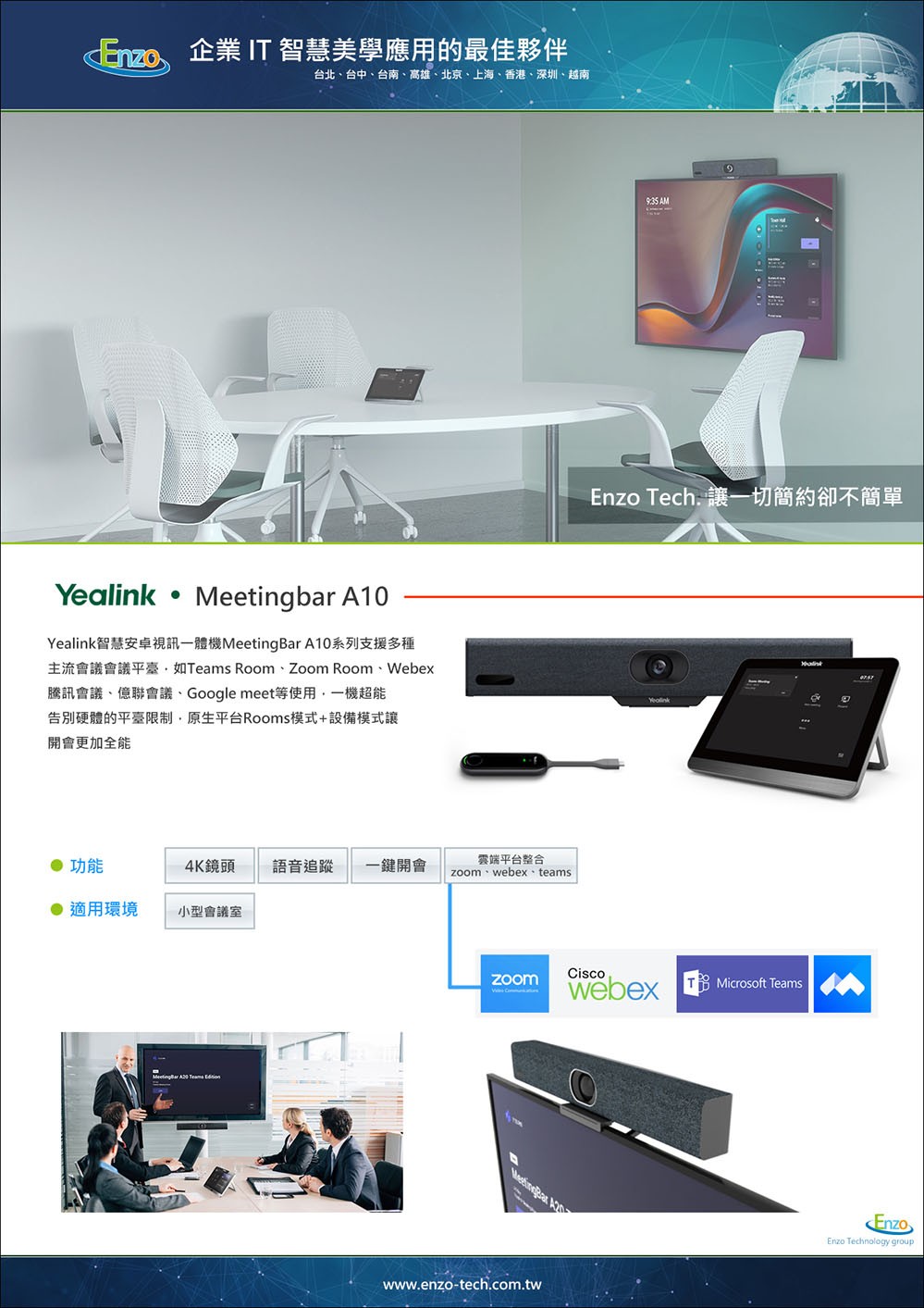 Yealink MeetingBar A10 是小型會議室的全方位視訊會議設備,整合 12MP 高畫質攝影機、8 MEMS 麥克風陣列與 15W 揚聲器,即插即用設計,快速部署。配備 133° 超廣角視野與 AI 智慧視圖,包括自動取景、講者追蹤及畫中畫,確保每位參與者清晰呈現。AI 噪音消除技術抑制背景噪音,提供全雙工清晰音質,拾音範圍達 3 米。支援 Qualcomm Snapdragon 670 晶片、電動隱私快門與多平台整合,如 Microsoft Teams、Zoom 等。無線內容分享與 USB-C 連接,提升遠距協作效率。適合小型空間 (最多 6 人),立即升級會議品質!