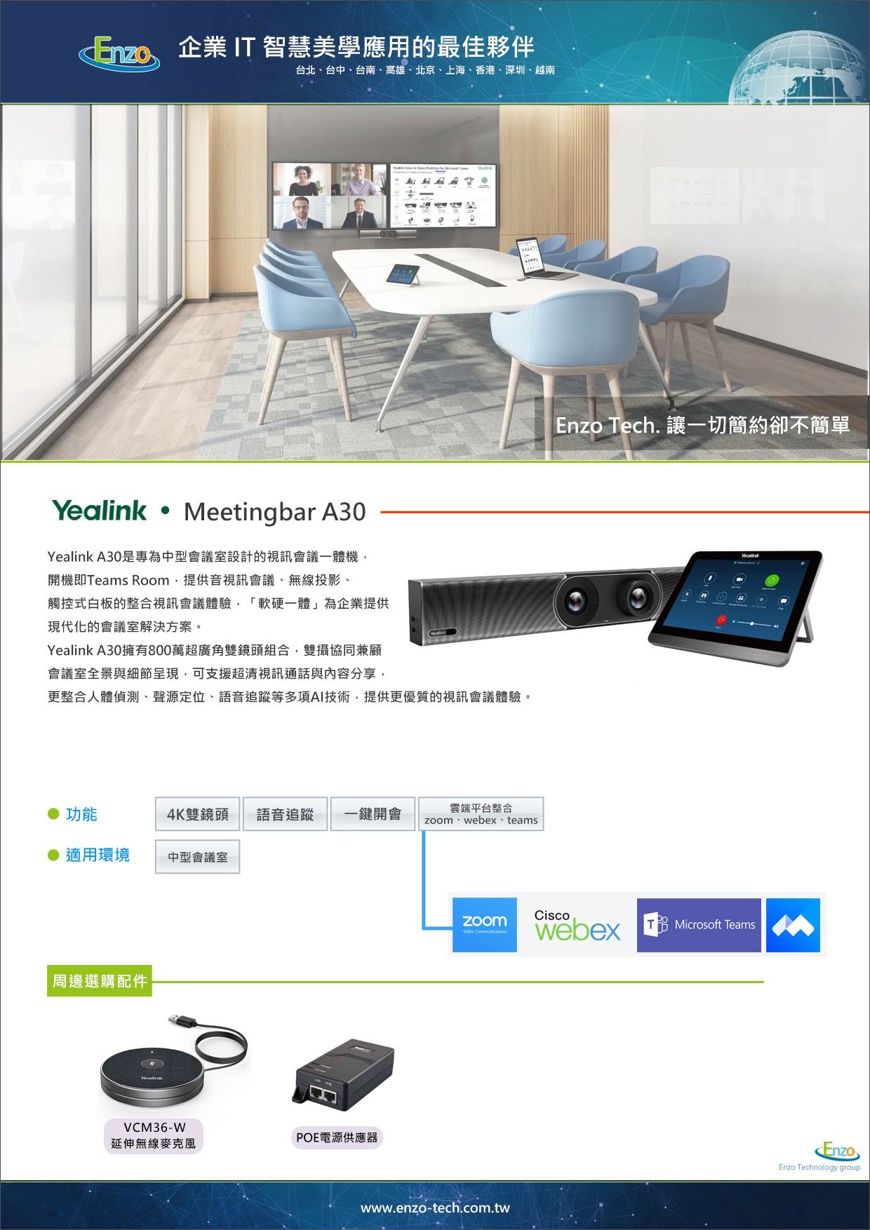 Yealink MeetingBar A30 是中型會議室 (最多 15 人) 的全方位視訊會議設備,採用雙攝影機系統:8MP 光學鏡頭提供 10x 混合變焦,4K 120° 廣角鏡頭精準捕捉空間細節與深度。AI 智慧功能包括自動取景、講者追蹤、畫中畫及智能畫廊,確保聚焦無干擾視圖。內建 8 MEMS 麥克風陣列與 25W 揚聲器,拾音範圍達 6 米,結合 AI 噪音消除技術,提供全雙工晶瑩音質。Qualcomm Snapdragon 845 晶片與 Android 9.0 系統,支援即插即用、無線內容分享及白板協作。雙頻 Wi-Fi 與 Bluetooth 連接,無需 PC,完美整合 Microsoft Teams 與 Zoom Rooms。簡易部署,提升遠距協作效率。立即升級會議品質!