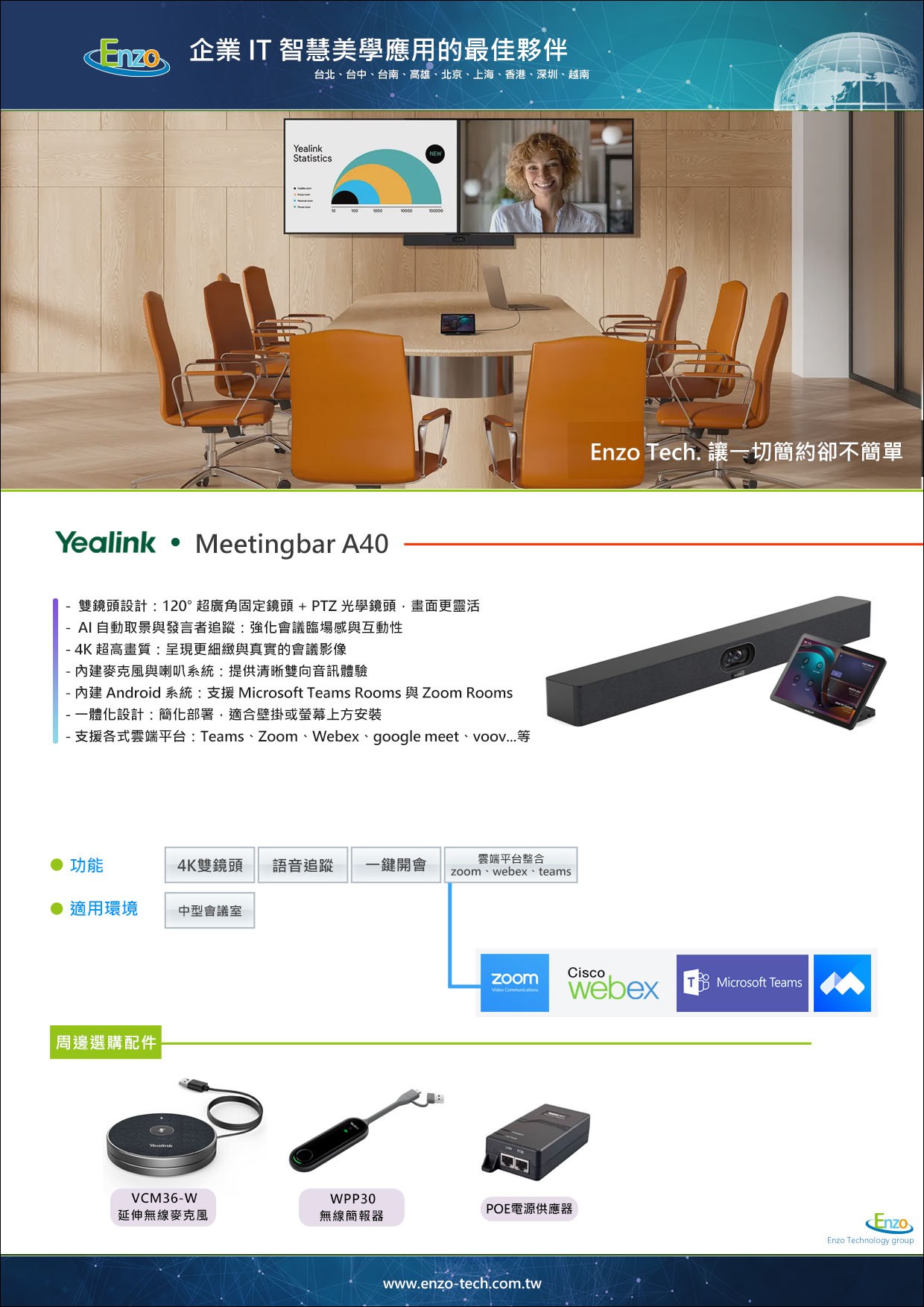 Yealink MeetingBar A40 是一款專為中型會議室設計的高階視訊會議系統,整合雙鏡頭 AI 技術與超廣角視野,提供自動取景、語音追蹤與智慧構圖等功能,確保每位與會者皆能清晰呈現。搭載高效音訊處理晶片與全雙工通訊技術,讓會議語音自然流暢不間斷。A40 支援 Microsoft Teams、Zoom Rooms 及 SIP/H.323 協定,兼容性極高,適合各種企業環境。其一體化設計大幅簡化佈線與安裝流程,讓企業輕鬆打造高品質遠距會議空間,實現高效、智慧且專業的協作體驗。