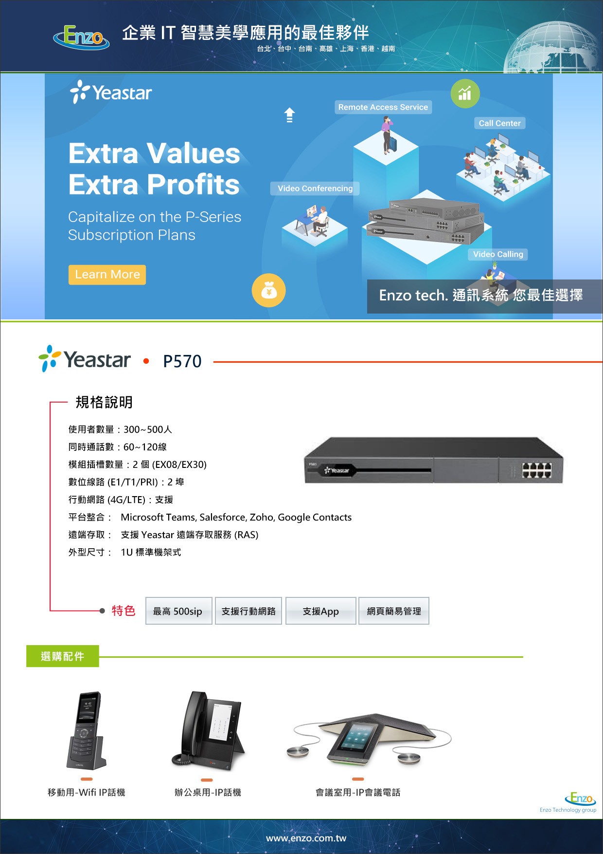 Yeastar P570 是專為不願在品質上妥協的企業所打造。它解決了大型環境下複雜的話務需求,更透過數位化的管理工具,讓通訊成為推動業績增長的利器。